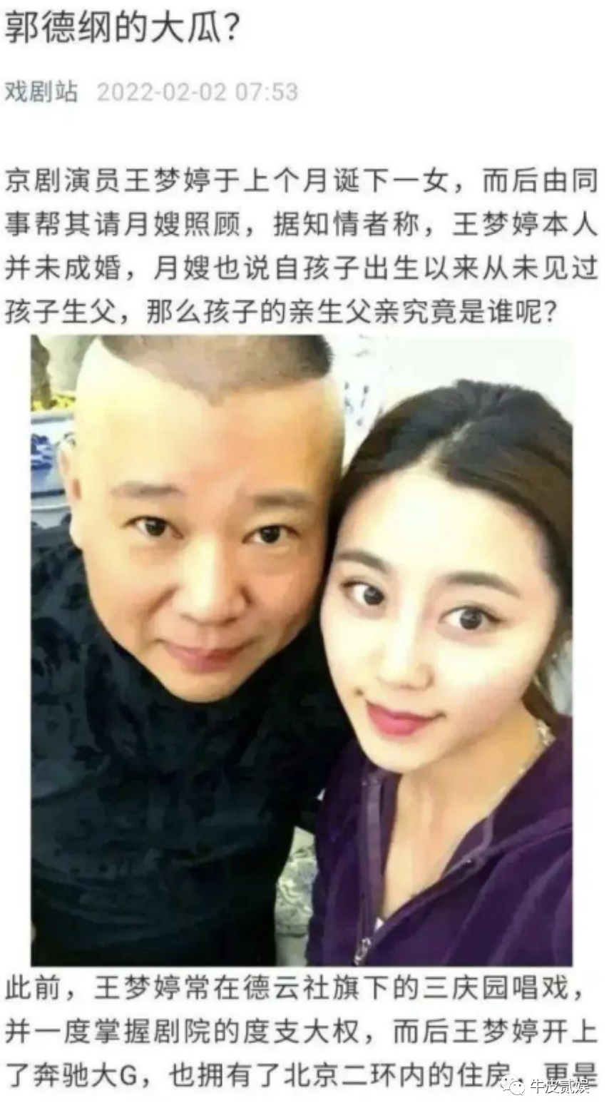 当时爆出郭德纲大瓜的是一个公众号,大概的意思是一名京剧演员王梦婷,最近未婚生下了女儿。