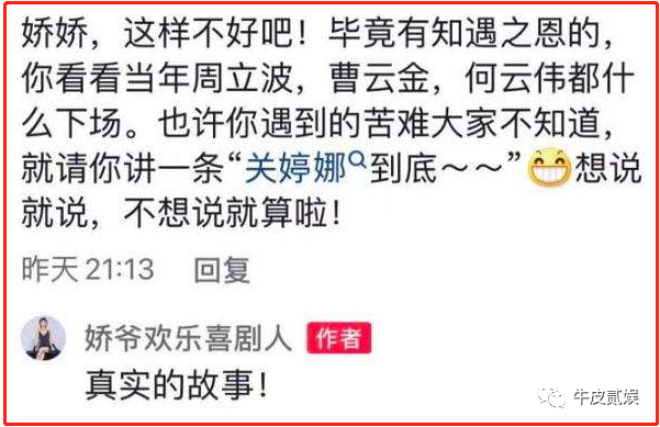 后来,新闻发酵后,有网友让娇娇讲一下关婷娜跟赵本山的关系。没想到,娇娇竟然回应了一句“真实的故事”。