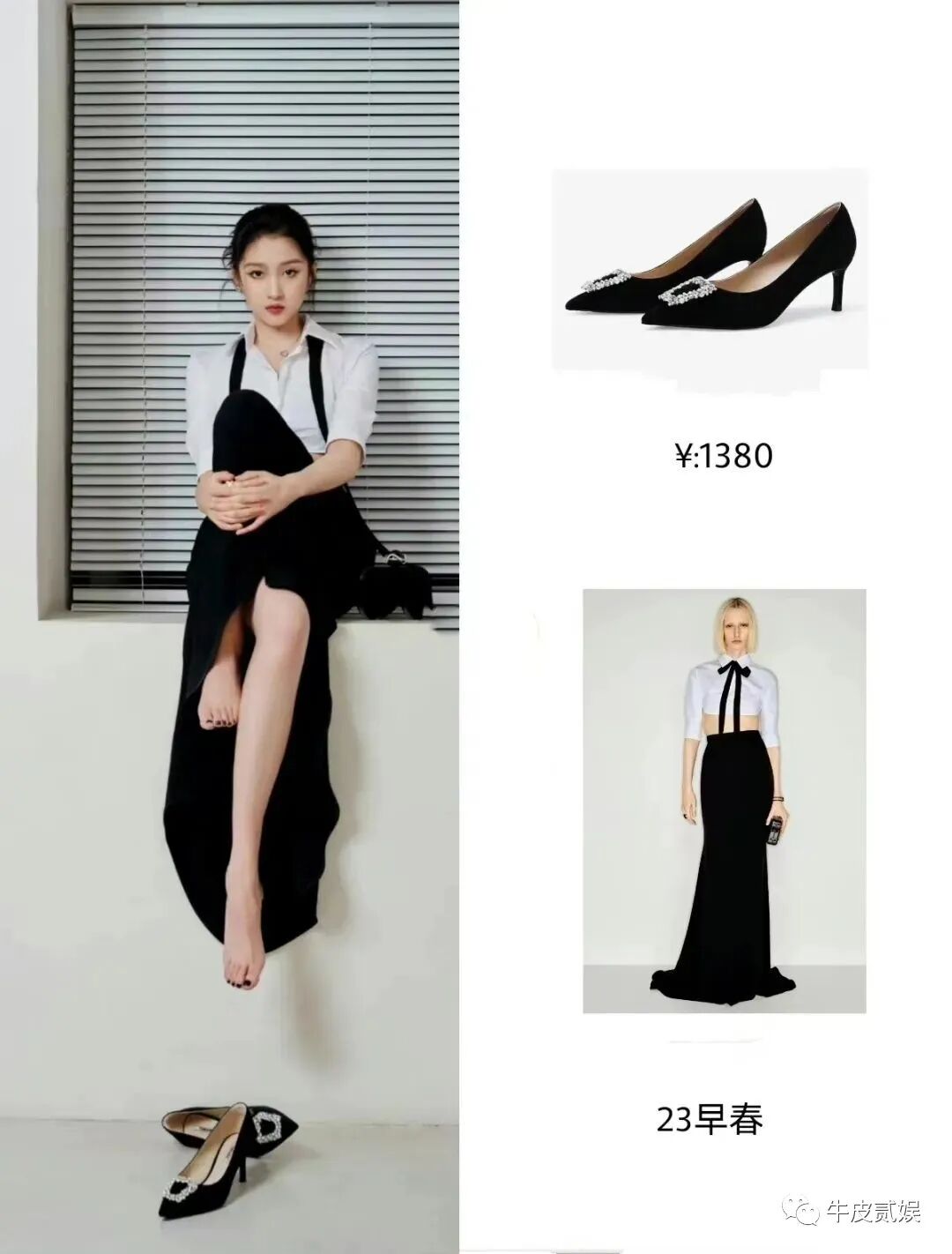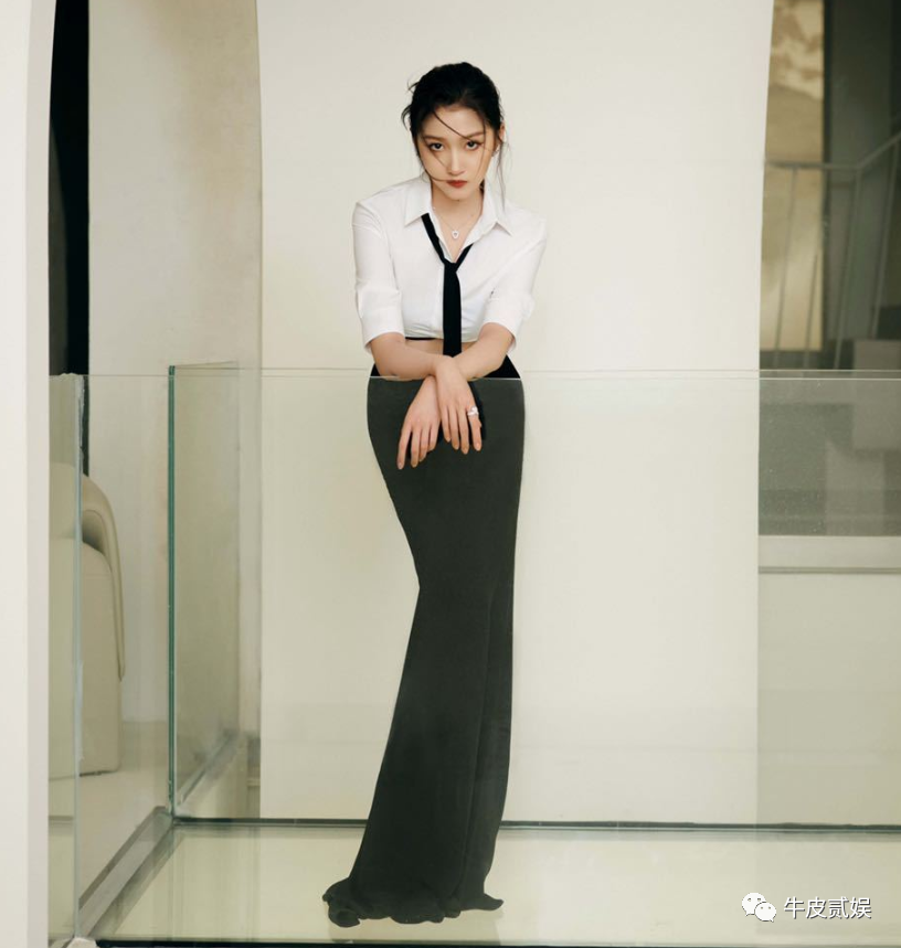 关妹子的上身是五分袖的白衬衫,领口微开,彰显性感,下身是一条黑色的鱼尾裙,看起来很摩登。