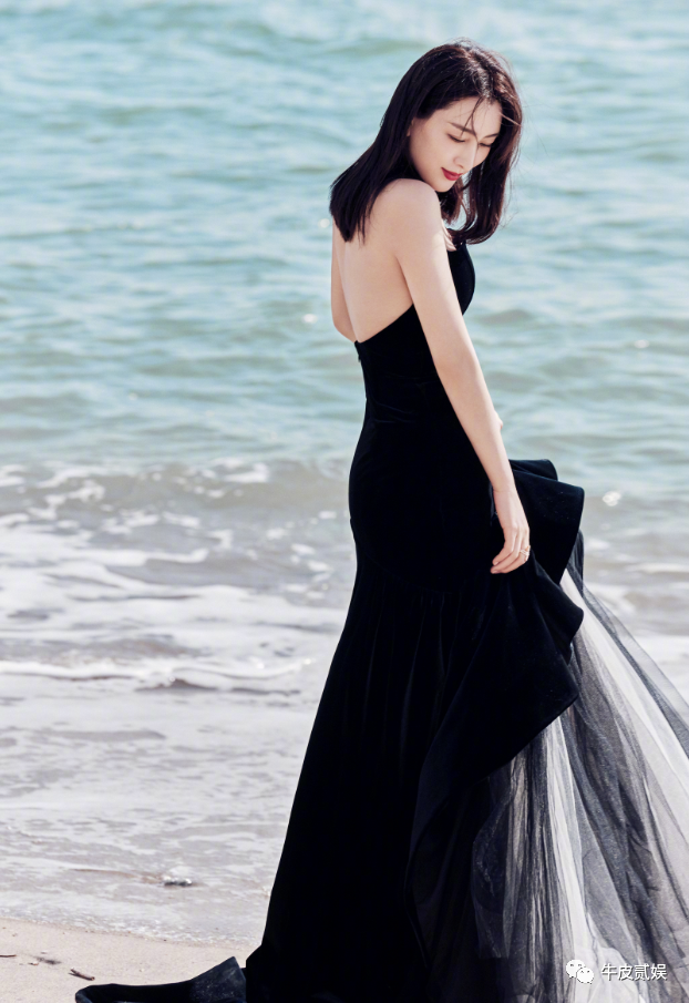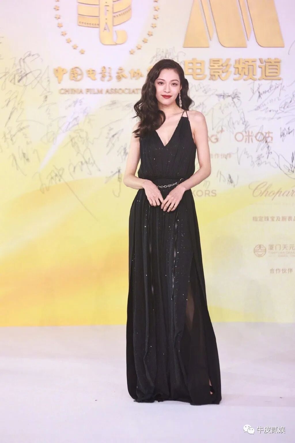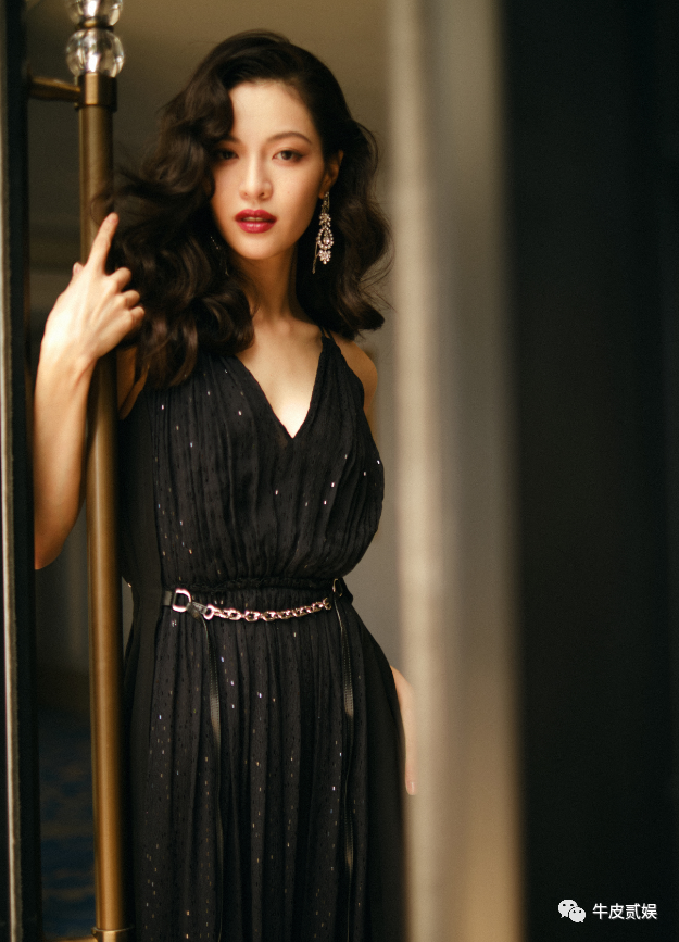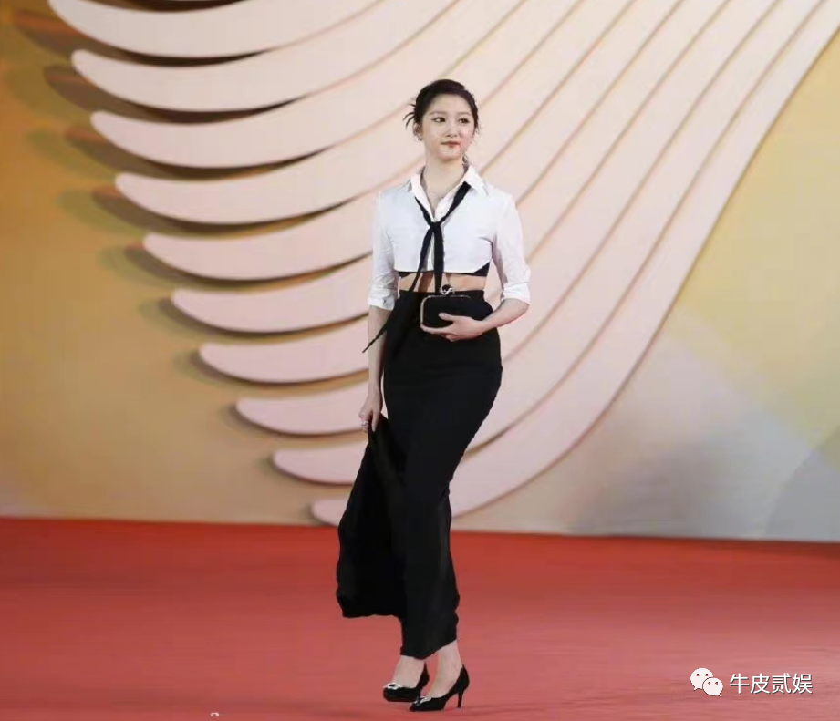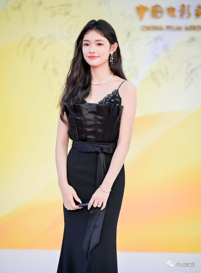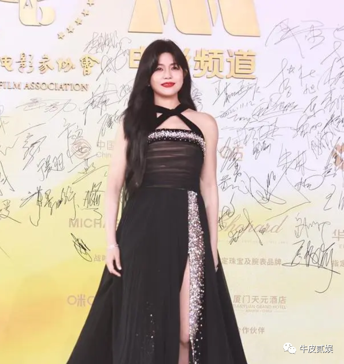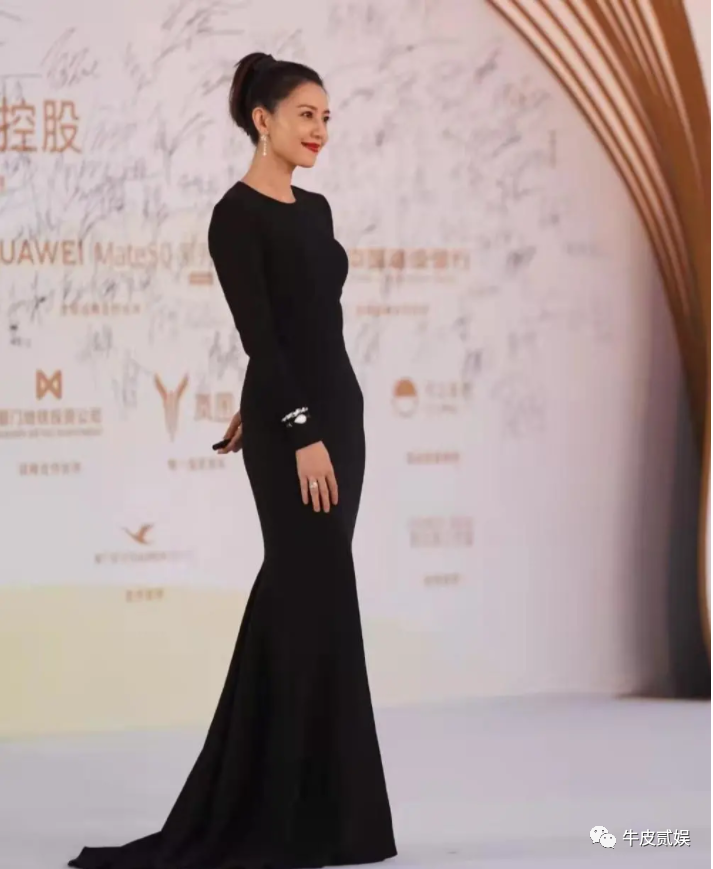 红毯上,她选择了一身黑色吊带长裙,简单大方,尽显知性优雅。