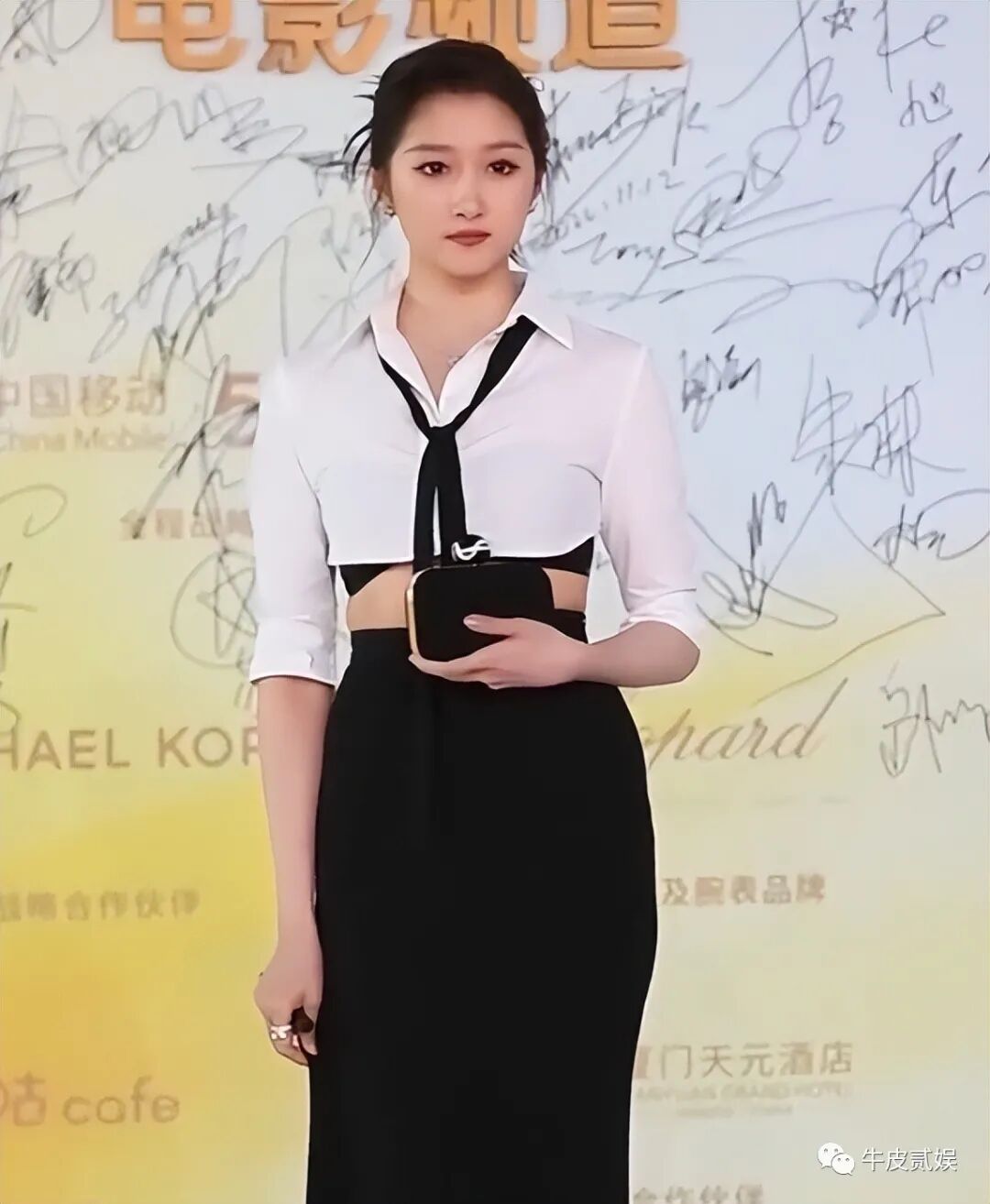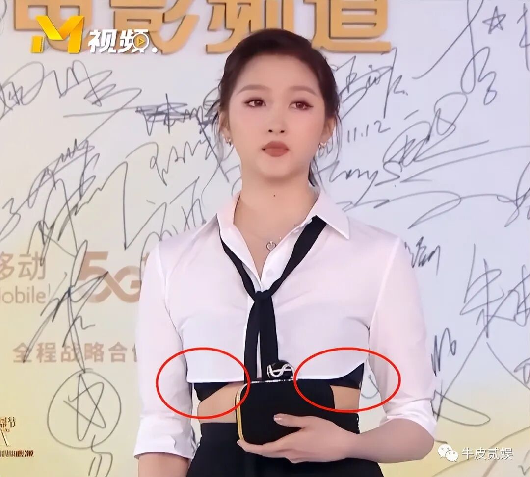 衣服的确是好衣服,只是关妹子最近伙食有点太好了,腰间的肥肉没有被白色的衬衫给藏住,结果被勒出个游泳圈。