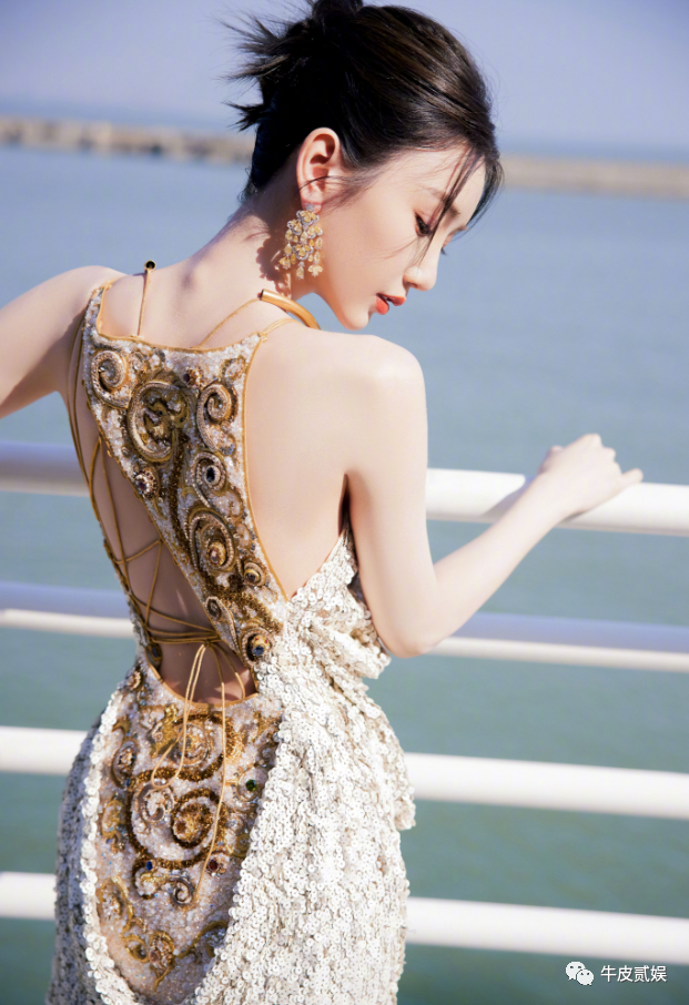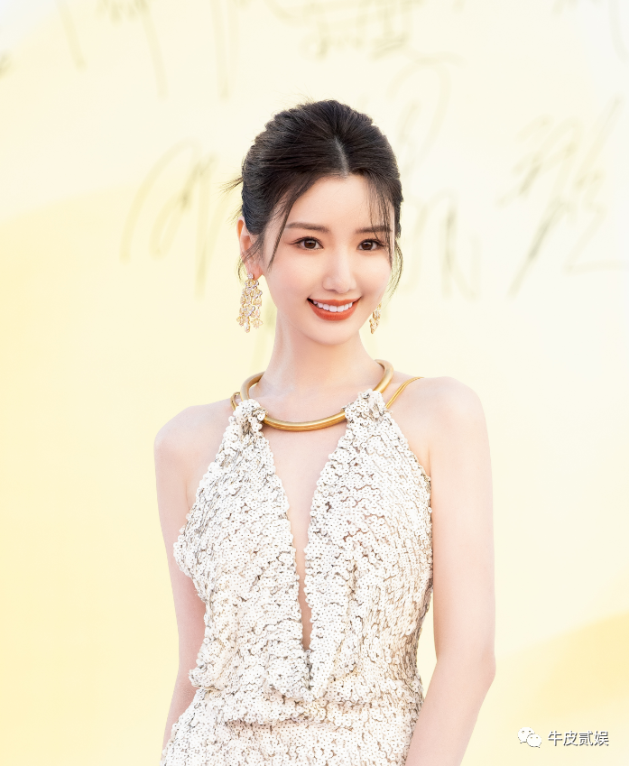 这次走红毯,毛晓彤身着金色深V包臀长裙,金色的挂脖设计,凸显毛晓彤的颈部曲线,很是诱人。