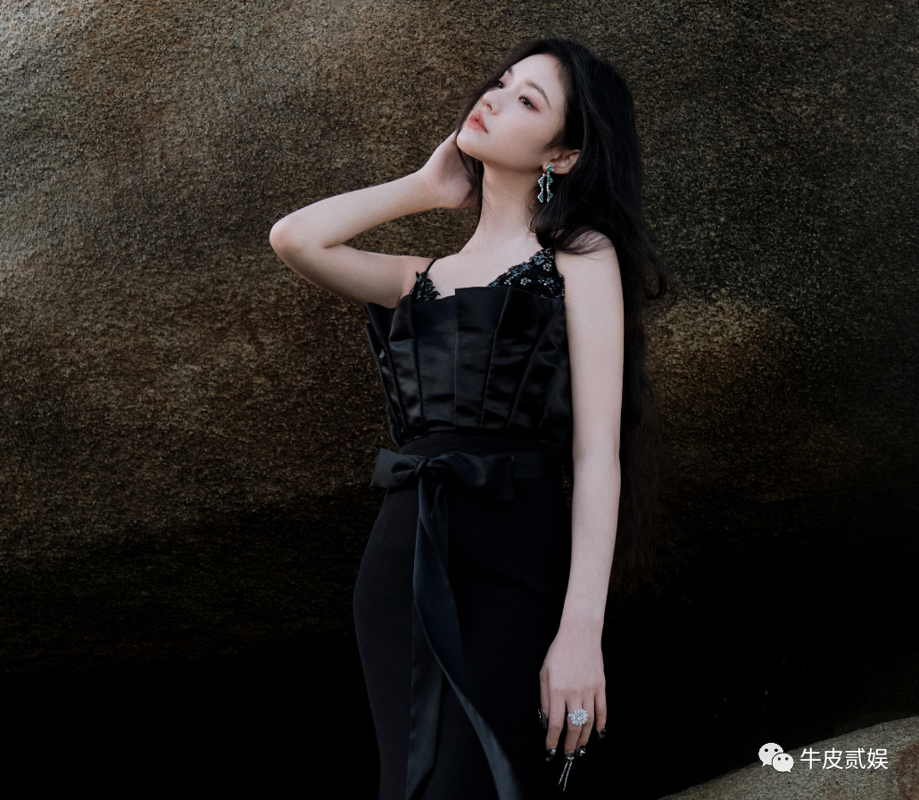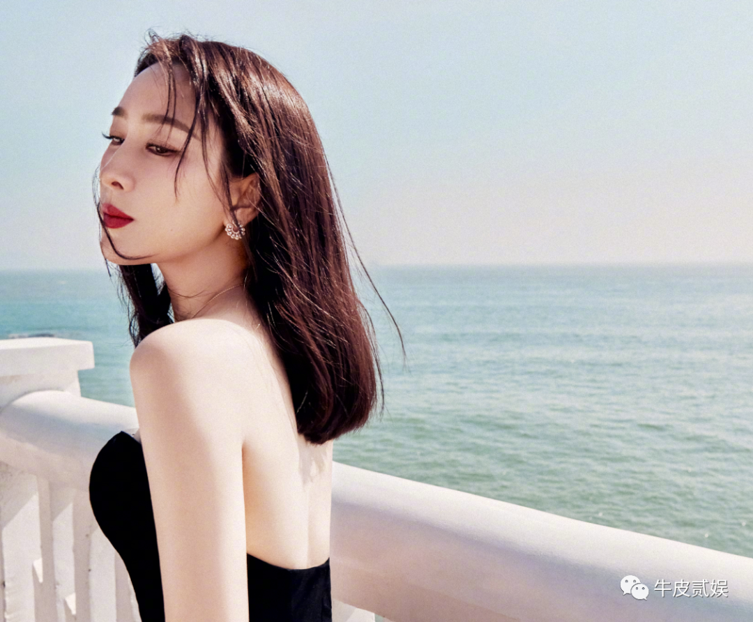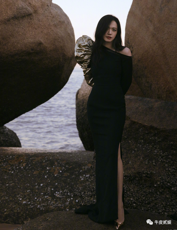 首先完全贴合万茜身体的设计,很好地凸显了万茜优秀的一字肩。