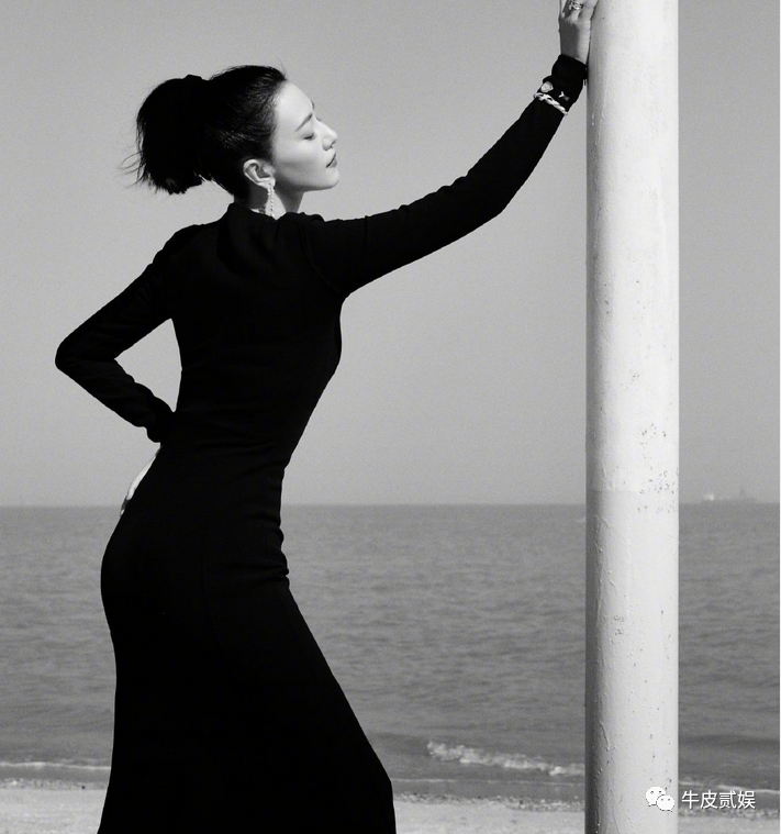 她全身是一身黑色装扮,没有一点裸露的地方,但却看起来优雅知性,也能凸显她的好身材。