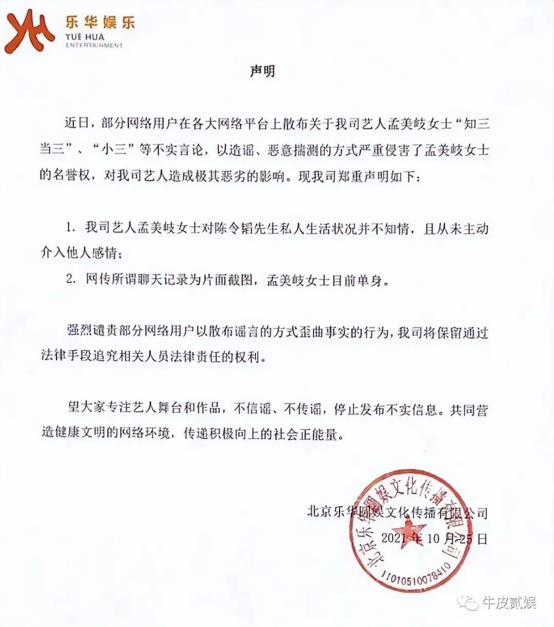 作为孟美岐的经纪公司那自然是要出面澄清的,直接一篇声明甩出,义正严词到:孟美岐至今单身,从来没有插足别人的感情。