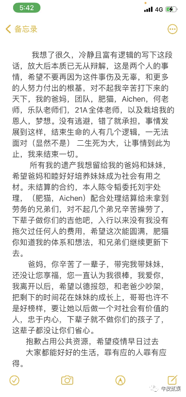 随后渣男陈令韬的回应更是让人哭笑不得,直接以遗书的方式回应,企图博取大众的同情。