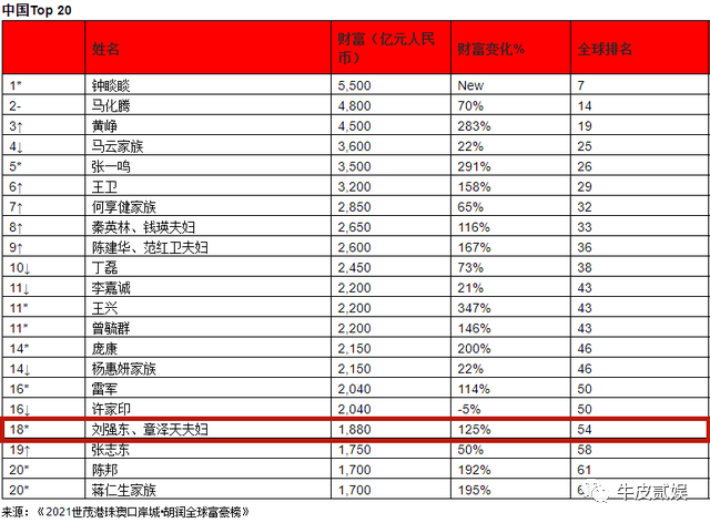 2021年,章泽天被财新峰会“女性领袖论坛”评选为年度创新力女性,并在当年的胡润富豪排行榜上,她和老刘以1880亿的财富,位居国内富豪第18名,全球富豪第54名。