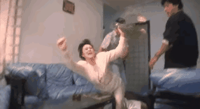 利智先是整个人摔在茶几上,玻璃碎片四溅,脸上痛苦的表情看起来十分真实。