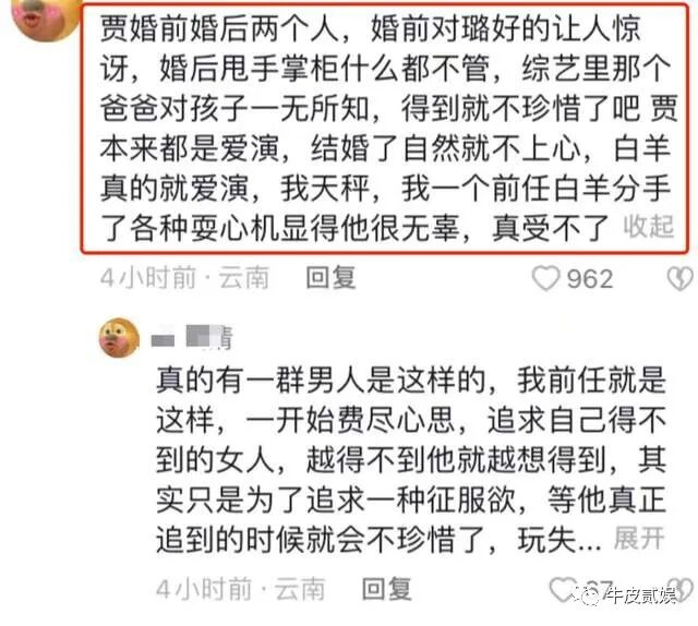 以至于很多网友会说,贾在婚前婚后是两个人,婚前对璐姐好得让人惊讶,婚后却做起了甩手掌柜,什么也不管。