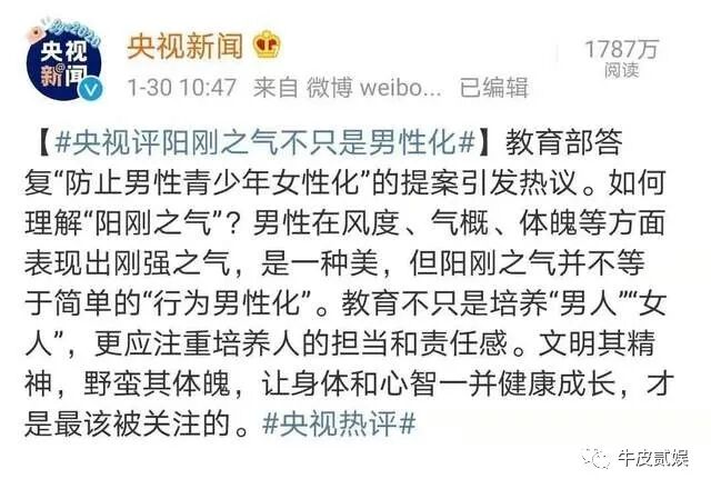 去年,官媒央视新闻针对“男人越来越娘化”问题,发表了自己的看法: