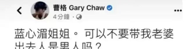 之后曹格又突然在网上发文,喊话让女艺人蓝心湄不要再带自己的妻子出去“认识”男人。