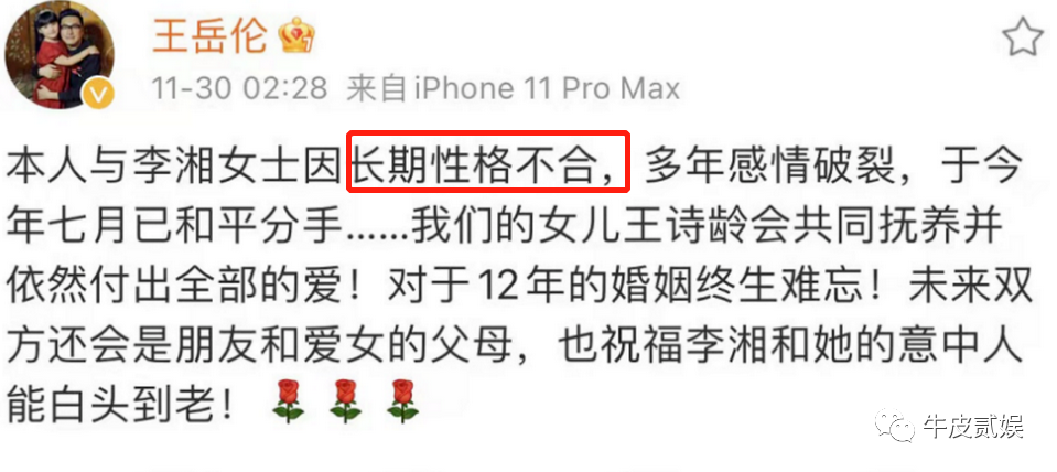 在离婚声明中,王岳伦用“长期性格不合”来总结这段婚姻破裂的原因。