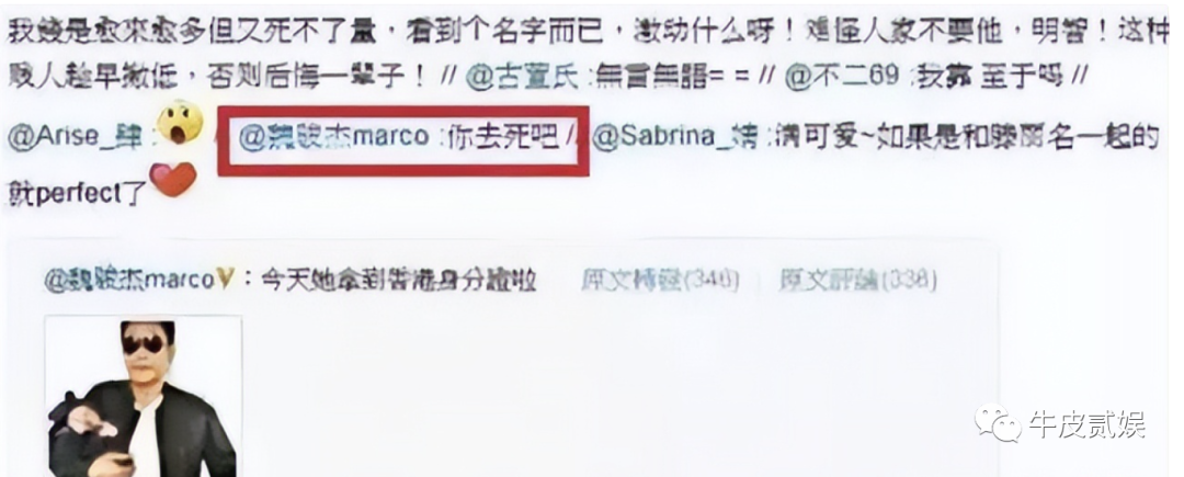 网友发了一句怀念他和滕丽名CP的评论,魏骏杰直接挂出去让人去死,根据后续回复的内容来看,很像是张利华拿着魏骏杰的账号开骂人。