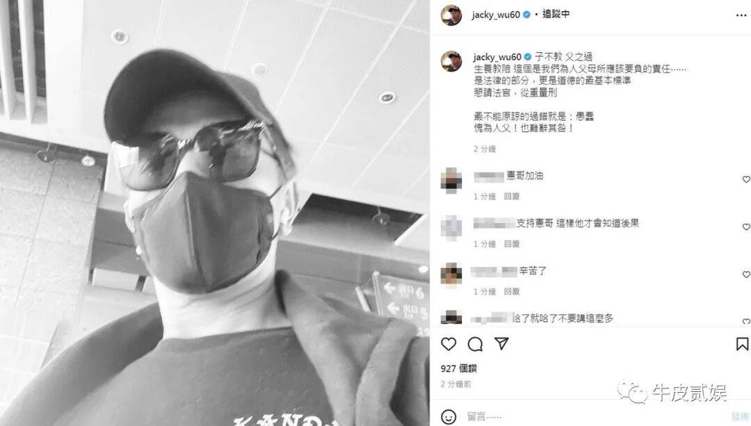 吴睿轩被捕之后,吴宗宪心痛地在社交账号上发布黑白照,并悲愤地写下了:愚蠢!愧为人父!也难辞其咎。