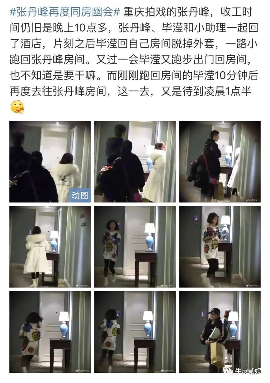 然而到了2018年,张丹峰却被曝光和自己的经纪人毕滢暧昧。两人不仅在日常生活中互动频繁,还曾在酒店房间里密会3小时。