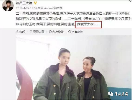 比如在董小姐发离婚宣言之前,王大治在2012年4月份在朋友圈写了一句莫名其妙的话:“我爱军大衣......”