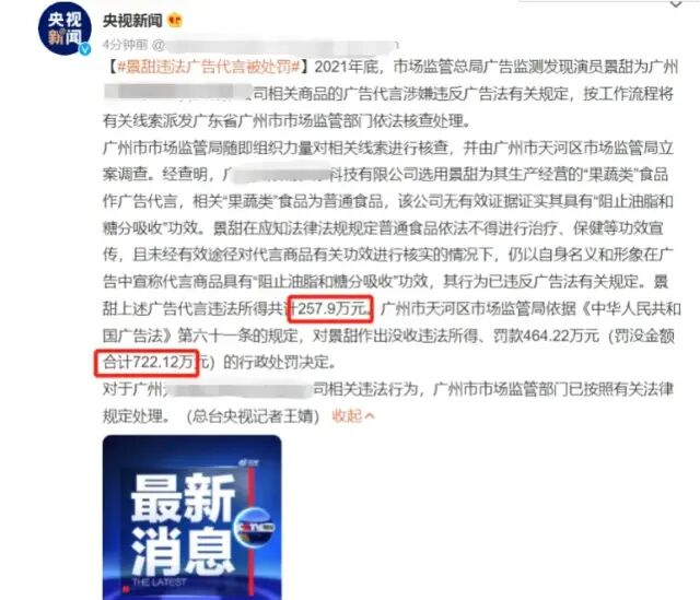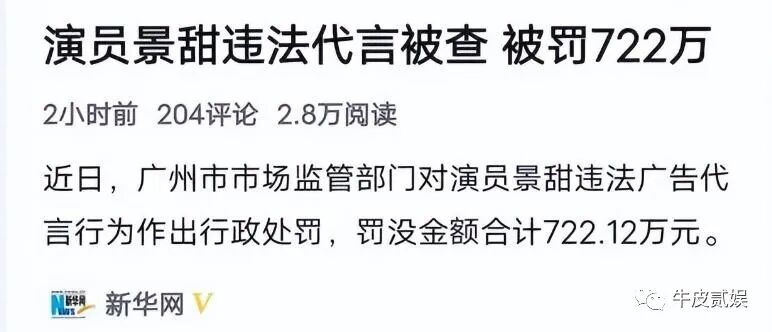 作为代言人的景甜没有尽到义务,对产品进行核实审查,也被处罚金共七百多万,央视点名进行批评,以此警示所有艺人。