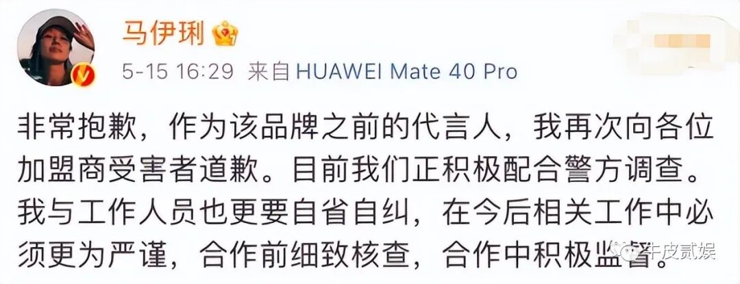 代言翻车后,马伊琍只是仅仅通过工作室发表了道歉声明,之后就没有下一步的动作了。
