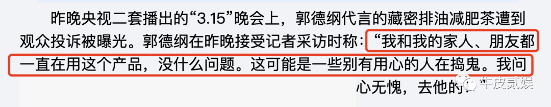 郭德纲看到后,有点儿不服气,他觉得自己代言的产品没有任何问题,是有人故意害他的。