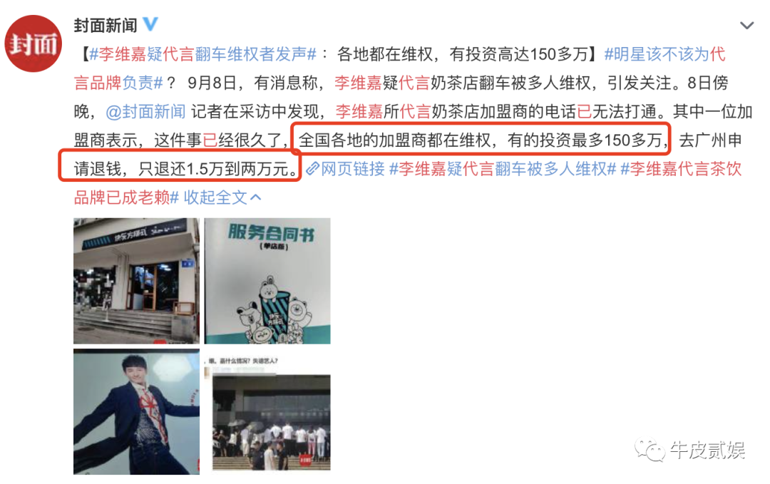 去 年9月9日,李维嘉代言的茶饮公司疑似跑路,导致加盟商受骗,最高金额高达150万,数目不小,影响极其恶劣。