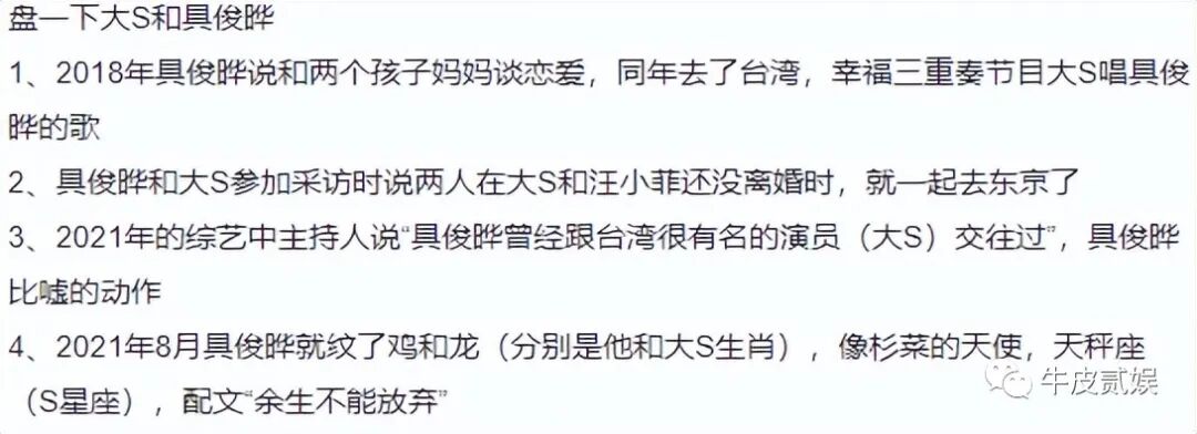 网友更是顺藤摸瓜,找到了大S与汪小菲婚姻存续期间,身在韩国参加节目的具俊晔,被身边好友曝出“正在和有两个孩子的人妻交往”。