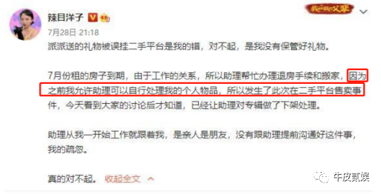 被网友发现后,她立马甩锅给了助理。