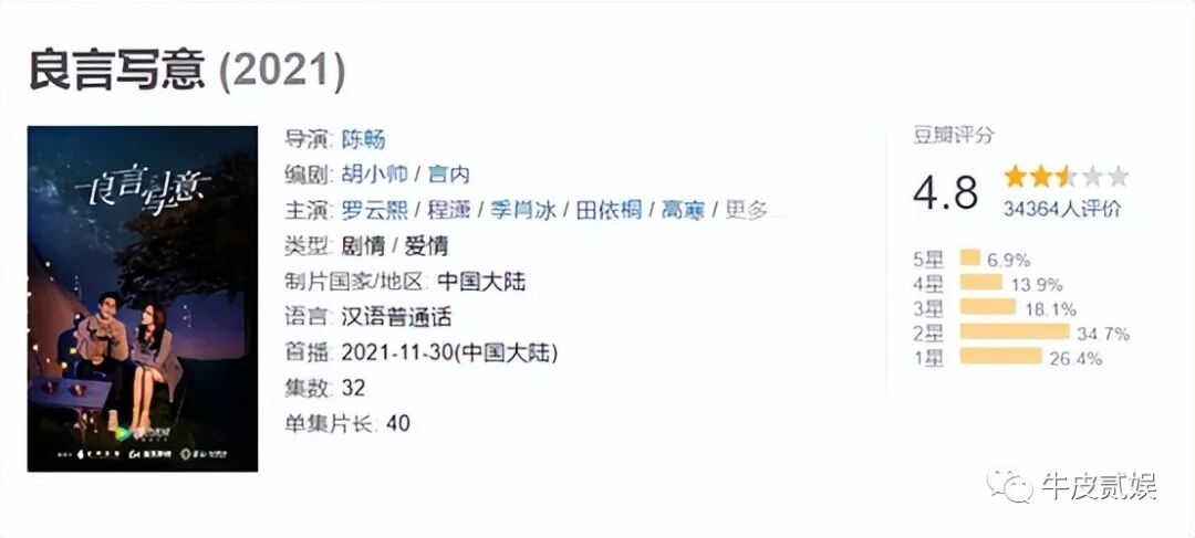 在豆瓣评分4.8分的《良言写意》中,与她搭戏的是古装男神罗云熙,可是也没能拯救她的演技。