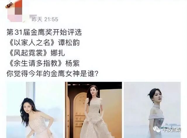 2022年的金鹰女神候选名单也已经出来了,杨紫、谭松韵、李一桐和古力娜扎都赫然在列。