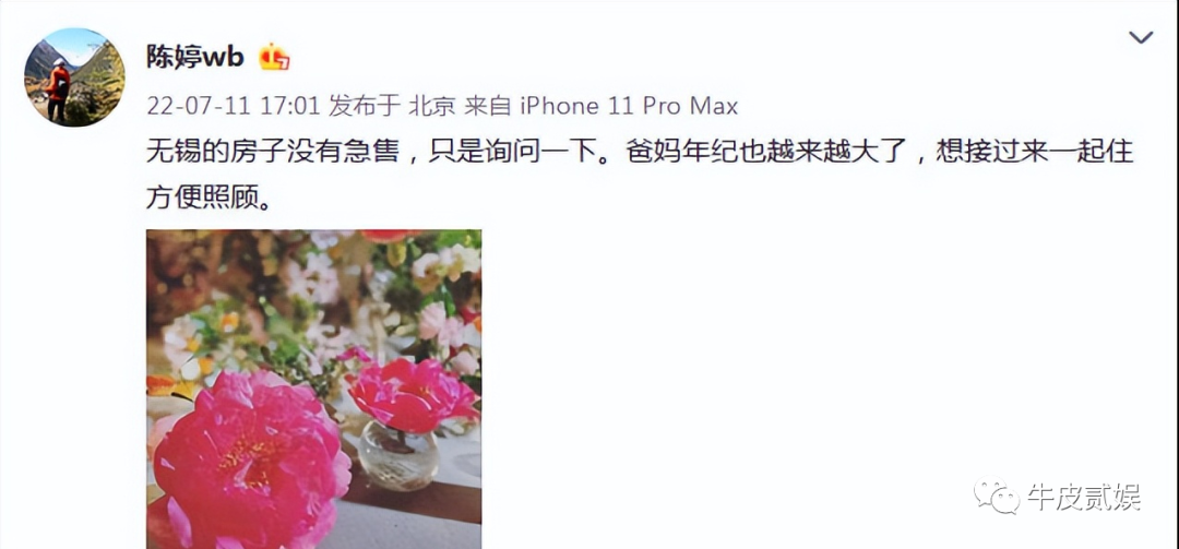 前两周,老谋子在网上急售无锡丈母娘的房子引起了热议,随后陈婷对此事做出了回应,并称父母年龄大了,想接父母来北京一起住。