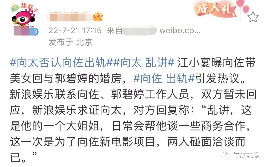 上个月生第二胎时,她在家坐月子,他却在北京给妙龄女子披衣,哄人家开心,并在和妙龄女子在他和郭碧婷的婚房内过夜。