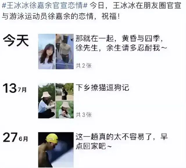 事情还要从一张朋友圈的截图说起,截图的内容很简单,就是官宣了王冰冰和徐嘉余的恋情。