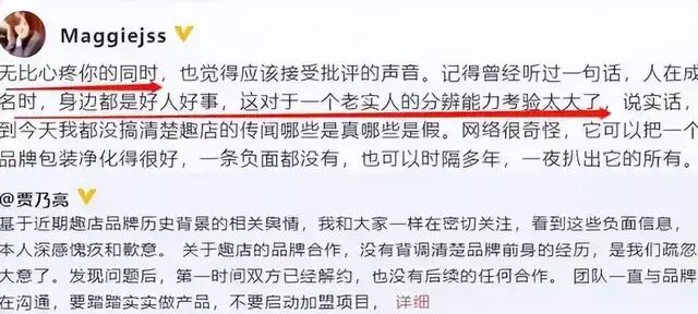 贾乃亮被骂,他的姐姐贾删心疼自己的弟弟,就站出来维护他,称弟弟为老实人,被趣店蒙骗了。