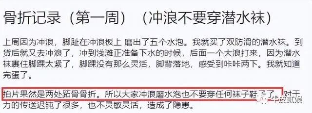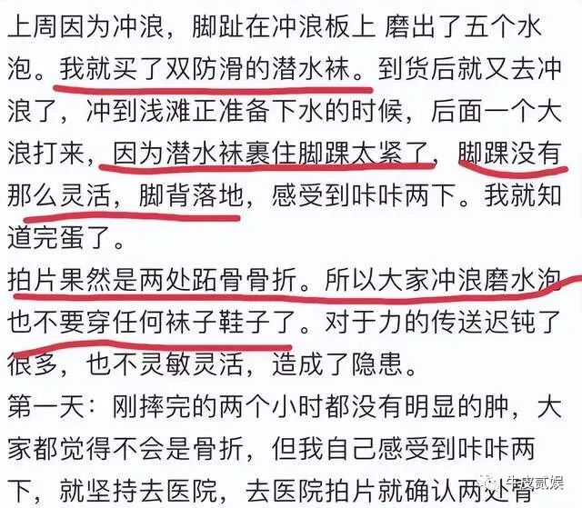 据她自己描述,她在冲浪的时候,穿着防滑的潜水袜,但正是因为这个潜水袜,导致她在冲浪的时候,裹得脚踝太紧了。