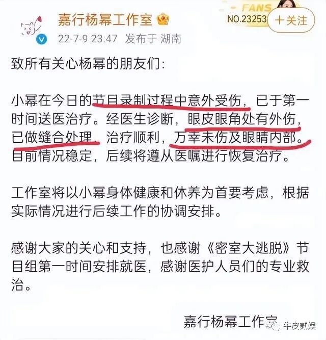 七月初,大幂幂在录制《密室大逃脱》节目时,导致自己的眼角意外受伤,并进行了简单的缝合手术。