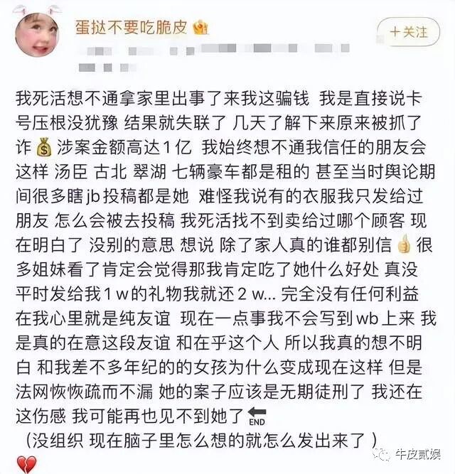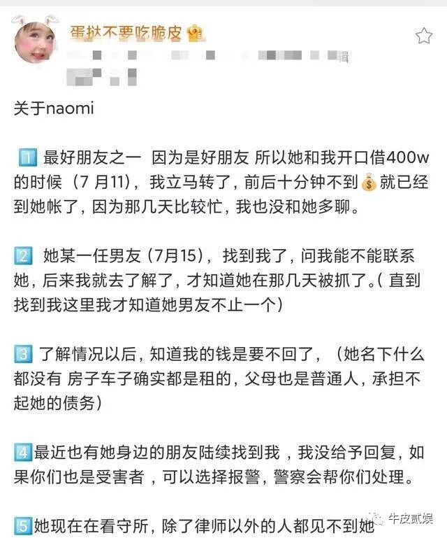 7月11日,一位自称是这妹子闺蜜的网友称,这妹子找他借了400万,因为平常看她出手大方,所以就毫不犹豫地把钱借给了她。