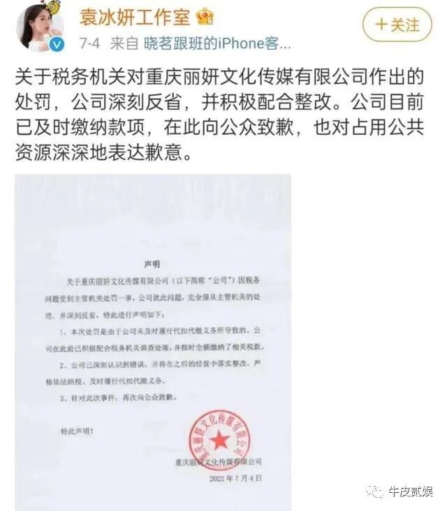 该事发生以后,袁冰妍的工作室赶紧发布道歉,套路和那些老前辈们几乎大同小异,比如补缴税款,占用公共资源啥的。