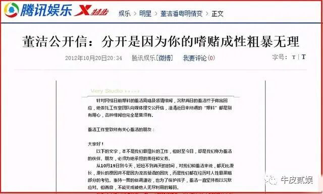 2012年10月,距离董洁的“神预言”恰好一年,董洁果然言出必行,深夜发文指控潘粤明不顾家,并要和他离婚。