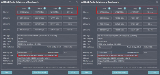 由于用料豪华、走线考究,小雕Z690的高频内存兼容性也是非常不错的。从测试可以看到,搭配DDR4 4400高频内存的小雕Z690内存带宽相比DDR4 3600高出很多,同时内存延迟也降低了不少,这无疑能在游戏中提供流畅的帧率,在生产力软件中也会获得更高的效率。