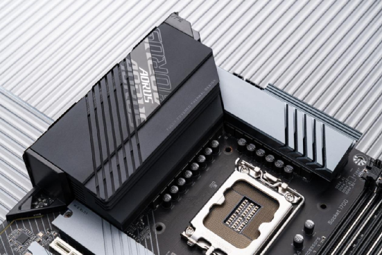 技嘉Z690 AORUS ELITE AX DDR4小雕(以下简称小雕Z690)配备了16+1+2相直出式数字供电,达到了豪华旗舰的水平。其中16相处理器供电和两相Soc供电配备了70A的DrMOS芯片,1相核显供电也配备了60A的DrMOS,更高额定电流的DrMOS芯片不但能让供电电路拥有更强的供电能力,还能有效降低工作时自身的温度,从而保证稳定性和延长寿命。此外,技嘉也为如此强大的供电电路配备了全覆盖式散热片,可以看到,加装在DrMOS芯片之上的VRM散热片非常厚实,磨砂的表面和复合式剖沟除了外观犀利之外也有效提升了散热面积,充分保证搭载酷睿i9旗舰处理器满载工作时供电元件也不会过热。