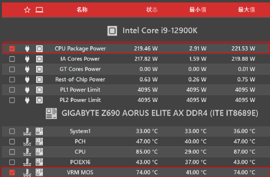 前面提到小雕Z690配备了16+1+2相直出式数字供电和强大的VRM散热装甲,那么搭配酷睿i9 12900K满血输出时的温度表现如何?我们使用Cinebench R23进行考机(室温28℃),酷睿i9 12900K的峰值功率达到了221.53W,而考机一小时后小雕Z690的VRM MOS温度仅为74℃,在只依靠被动散热的情况下这个表现已经非常不错了,如果机箱中正确安装了风扇组建散热风道,那么这个温度会更低,可见,小雕Z690的供电电路与散热设计HOLD住火力全开的酷睿i9 12900K是完全没有问题的。
