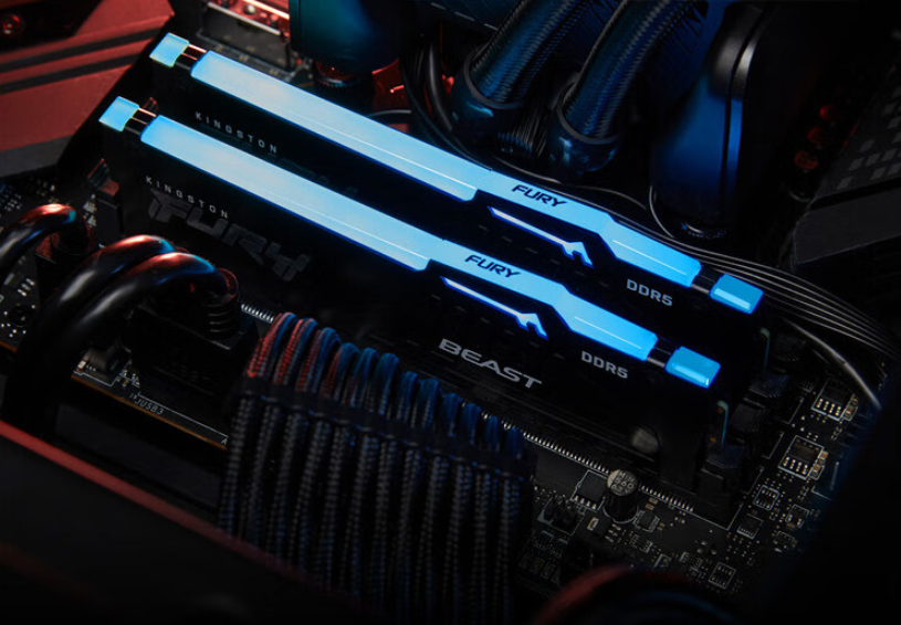 锐龙9 7950X只能支持DDR5内存,为了能充分发挥出其全部实力,建议至少选择6000MHz及其以上的高频DDR5内存。Kingston FURY Beast野兽系列DDR5 5200 16GB继承了FURY野兽(Beast)系列的外观风格,采用了纯黑的金属散热装甲设计,金属质感浓烈,正面可以看到FURY的金属铭牌Logo,而在右侧中心位置,则是BEAST的产品名称。