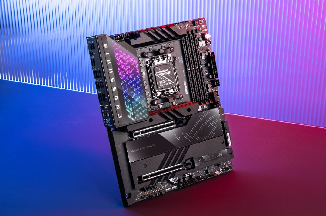 与锐龙9 7950X搭配的主板方面,站长首推华硕ROG CROSSHAIR X670E HERO。该主板采用了ROG CROSSHAIR系列新一代的设计语言,充满精致感。主板芯片组散热片上的ROG LOGO以点阵化的形式演绎,风格独特。