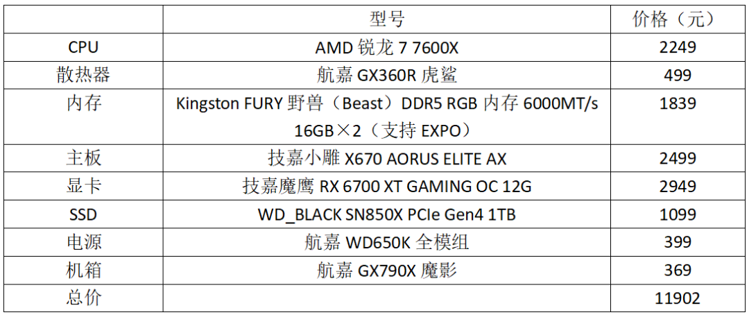 大家期待已久的锐龙7000终于上市了,得益于全新5nm工艺制程以及ZEN4架构,新产品将性能拉到了一个新的高度。对于想要打造游戏平台的玩家来说,锐龙7 7600X就是个非常不错的选择。作为一款中端定位的产品,能提供比酷睿i9 12900K还强的游戏性能,表现真的很强悍。接下来就给大家带来一套高性能的锐龙7 7600X套装,供大家在年底装机时进行参考。