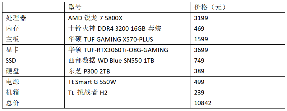这套配置对电源的要求其实并不高,因为我们实测华硕TUF-RTX3060Ti-O8G-GAMING的满载功耗只有206W,锐龙7 5800X的TDP也才105W,配个额定功率为550W的电源基本够用了。