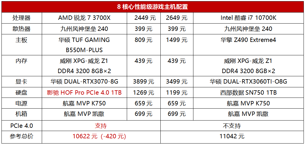 可以看到,由于AMD锐龙7 3700X加上主板的套装价格相对Intel酷睿i7 10700K的板U套装价有高达890元的价格优势,因此即便是选择更贵的RTX 3070显卡和PCIe 4.0固态硬盘,整机价格还是比搭配RTX 3060 Ti显卡的Intel酷睿i7 10700K低了420元之多。虽说Intel酷睿i7 10700K也可以搭配便宜的B460主板来缩小价格差距,但这样既不能超频,也不能使用超过DDR4 2933的高频内存,性能损失实在太大,搭配自然就显得非常不合理。如此一来,由于AMD锐龙7 3700X平台的高性价比,搭配更强的RTX 3070显卡自然就能获得更强的游戏性能,同时PCIe 4.0固态硬盘也能带来远超PCIe 3.0固态硬盘的传输速度,提供更加快捷的游戏载入体验。