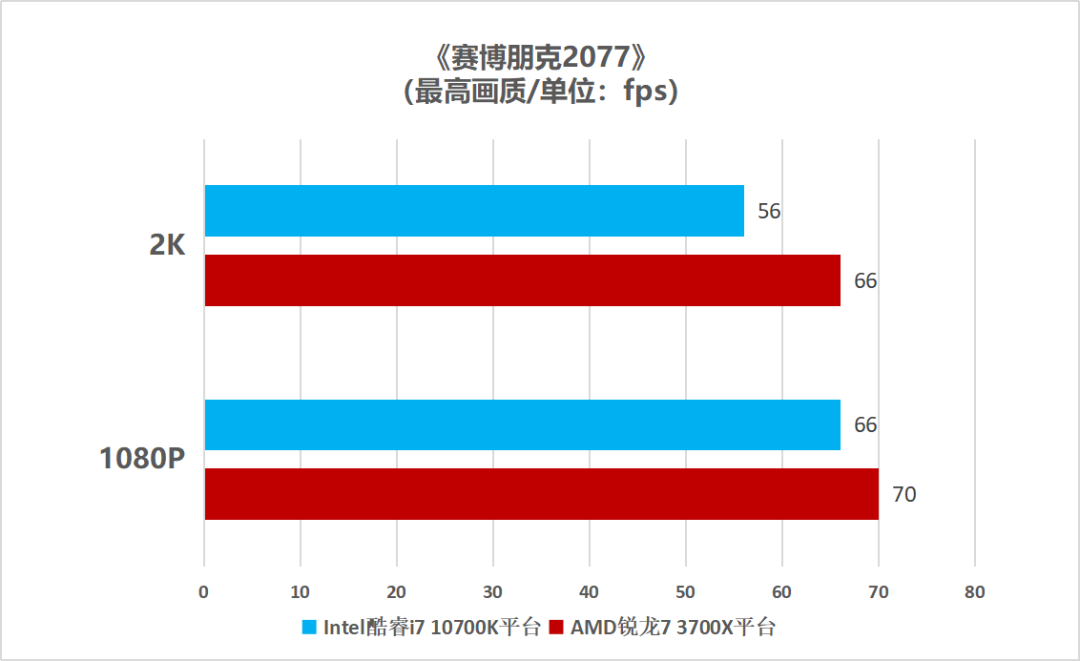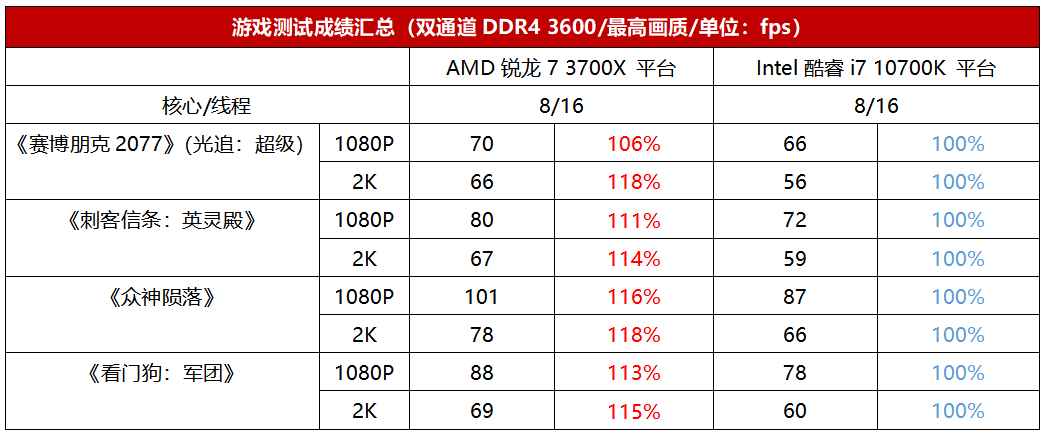 其实从装机配置我们就能预估到测试结果了。由于AMD锐龙7 3700X平台巨大的价格优势,因此可以在大致相同的预算下选择性能更强的RTX 3070显卡。而Intel酷睿i7 10700K平台由于板U总价过高,受限于总预算只能选择性能弱一些的RTX 3060 Ti。所以从实测情况来看,在四款最新的3A游戏大作中,AMD锐龙7 3700X整机游戏性能表现都要更好一些,特别是在2K分辨率下,优势更加明显,《赛博朋克2077》和《众神陨落》2K下的帧率优势甚至达到了18%之多,高出Intel酷睿i7 10700K平台一个档次。总而言之,在同预算的前提下选择AMD锐龙7 3700X装机,可以获得比Intel酷睿i7 10700K更好的游戏体验,而且整体价格甚至还可以进一步优惠,不得部说AMD锐龙7 3700X确实是当下8核处理器中的爆款甜品。