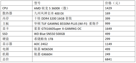 站长点评:在这套推荐的配置中,站长选择了锐龙5 3600X+GTX1660S的组合,这两款产品算是目前千元级性能最强的CPU和显卡了,足以保证在1080P和较高的画质下流畅运行各种3A大作。搭配144Hz的电竞显示器,还能获得超流畅的游戏视觉体验。