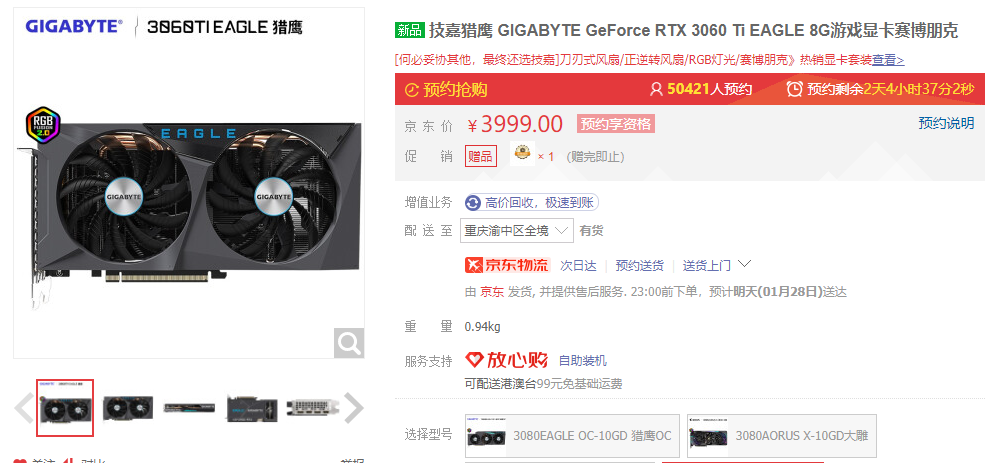 如果是三方店铺,显卡加价就有些离谱了。像技嘉RTX 3060 Ti GAMING OC PRO魔鹰卖到了5999元,加了2200元。虽然贵,优势是只要你肯花钱,马上就能买下。加价买显卡适合那些预算充足,对价格因素不怎么敏感的玩家。