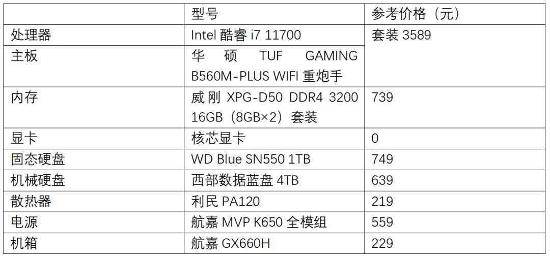 由于B560主板不支持处理器超频,所以用来搭配非K处理器就非常合适了。在这里我们选择了性价比相当高的酷睿i7 11700处理器,其同样拥有8核心16线程的规格,频率方面略低于酷睿i7 11700K/KF,但最高睿频也达到了4.9GHz,无论是游戏还是生产力方面的表现都比较不错,购买板U套装的性价比也比较不错。同时其还内置了新一代的英特尔锐炬Xe架构的UHD750核芯显卡,核显性能较上代也大幅提升,面对《英雄联盟》《CS:GO》这样的电竞网游不在话下。另外其还拥有H.265、AV1等多种视频解码能力,视频剪辑能力也非常不错。在显卡价格昂贵且难以购买的今天,用来过渡非常合适。