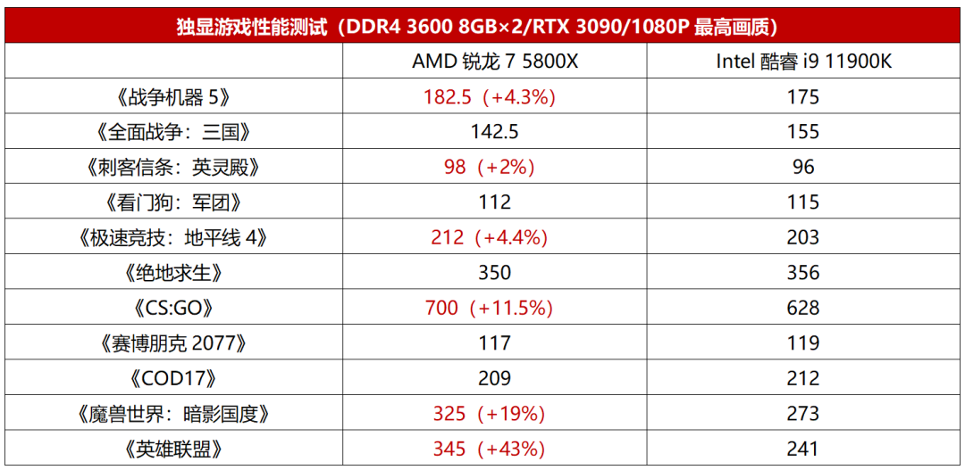其次是游戏性能测试。ZEN3上市时就依靠极高的IPC在电竞网游中提供了非常夸张的帧率,而11代酷睿的IPC也宣称大幅提升,那在电竞网游中是否扳回一局呢?答案是否定的。从《CS:GO》、《魔兽世界:暗影国度》、《英雄联盟》三款热门网游的测试来看,AMD锐龙7 5800X相对Intel酷睿i9 11900K的优势分别为11.5%、19%和43%,看来Cypress Cove架构也没能让11代酷睿在电竞网游中翻身,和ZEN3的差距依然巨大。终于,在更侧重显卡性能的3A大作方面,Intel酷睿i9 11900K终于能够和AMD锐龙7 5800X打个互有胜负了,只不过帧率差别只有个位数而已,几乎可以理解为正常误差。综合来看,Intel酷睿i9 11900K要重夺“最佳游戏处理器”的宝座似乎有点难,面对AMD锐龙7 5800X都力不从心,更不用提挑战更强的AMD锐龙9 5900X了。